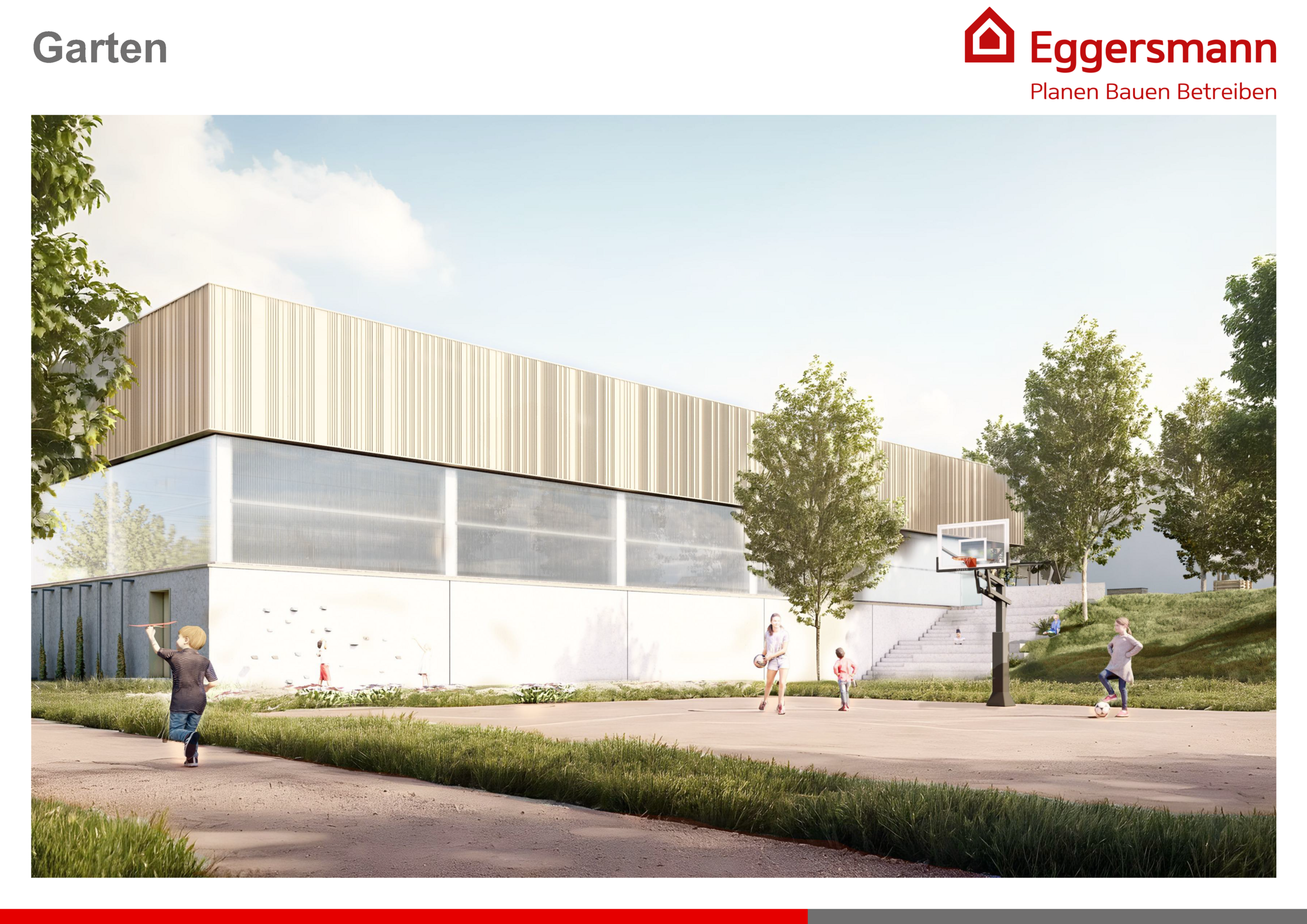 Die neue Sporthalle integriert sich trotz ihrer Größe gut in die Hanglage des Hortgrundstücks und ist entsprechend architektonisch gestaltet. Sie lässt sich in insgesamt drei Felder aufteilen, die mittels eines stabilen Vorhangs getrennt werden können. Ausgestattet ist die Dreifeldsporthalle unter anderem mit Fußballtoren, Basketballkörben, Schaukelringen, Kletterstangen und Sprossenwänden. Im Erdgeschoss befinden sich WCs, Duschen und Umkleideräume.